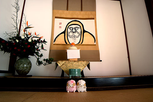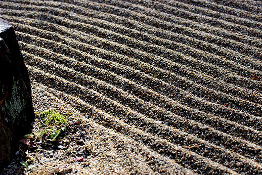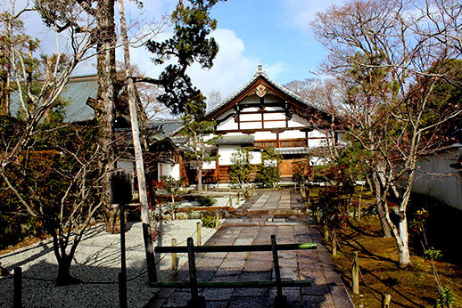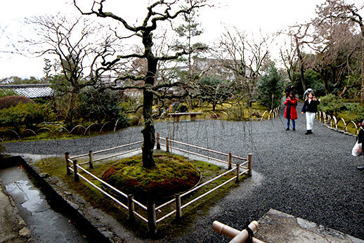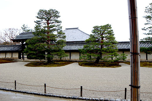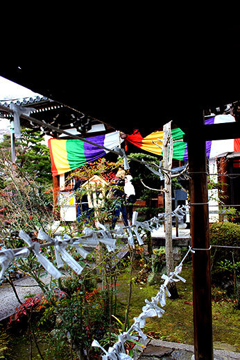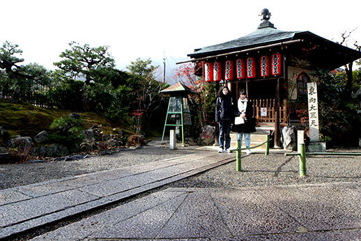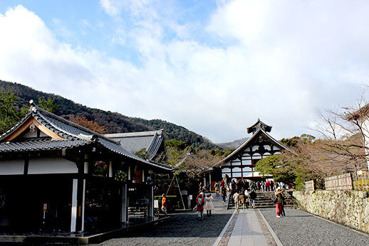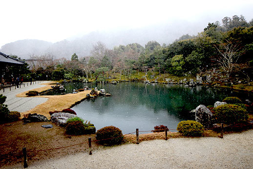 Notre première destination a été le temple de Tenryu-ji. Il occupe beaucoup d’espace, cela nous a pris un peu de temps de le parcourir de bout en bout. Il est possible de visiter uniquement le jardin, le temple, ou d’avoir un prix qui combine les deux visites. Nous avons opté pour ce dernier, ne sachant pas trop à quoi nous attendre, et il s’avère qu’un des deux aurait pu suffire : celui du jardin. La visite du temple n’apporte pas grand chose, car les seuls endroits où nous avons eu accès nous permettaient juste d’avoir une jolie vue sur le jardin. À part le plaisir d’enlever nos chaussures et de déambuler avec nos chaussons trop petits sur le sol en bois du temple, ce ticket n’apportait pas vraiment grand chose. C’était cependant appréciable d’être à l’abri lorsque la neige a commencé à tomber.