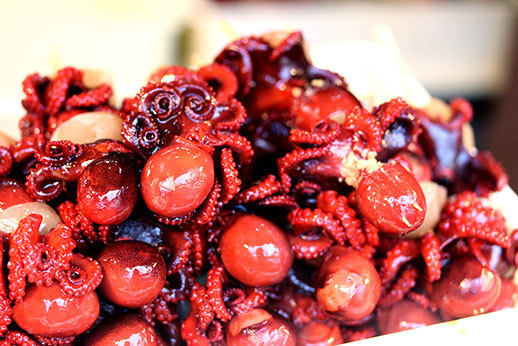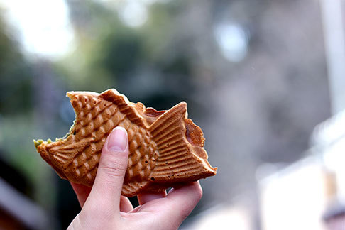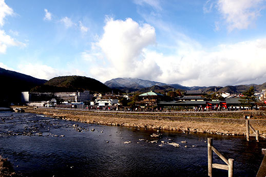 Nous avons ensuite quitté cette zone boisée pour déambuler dans les rues principales, en direction du pont Togetsukyô ("pont qui traverse la lune", rien que ça). Sur notre chemin, nous avons trouvé beaucoup de stands proposant des choses à manger !