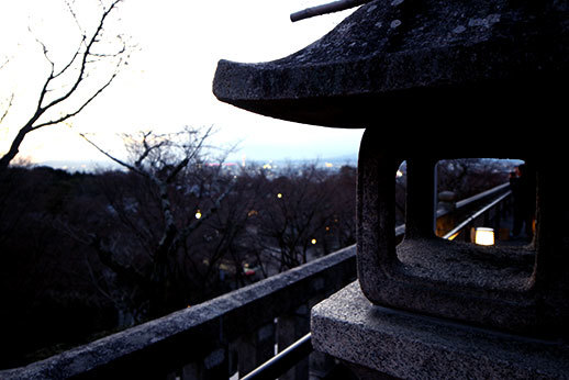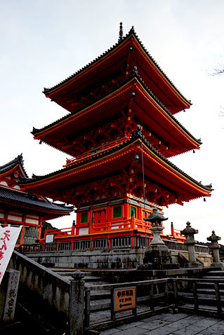 Nous avons fini par atteindre le pont. Nous avons admiré la vue, puis nous sommes vite repartis vers la gare pour aller jusqu’au temple Kiyomizudera avant sa fermeture à 18h. C’est un temple très grand qui regroupe plusieurs structures, dont l’extérieur d'une des plus importantes était en travaux. Il faut traverser celle-ci pour atteindre une autre zone du temple, mais l’accès est payant. Nous avons trouvé le prix cher pour une si petite traversée, il y avait d’autres possibilités pour atteindre la zone en question. Et surtout, l’intérieur n’était pas si intéressant que ça. Ce temple reste tout de même une bonne expérience, car il reste très beau, il permet d’avoir une très jolie vue sur la ville de Kyoto. C’est de plus le temple le plus emblématique de la ville, que nous n’avions pourtant pas visité lors de notre précédent voyage !