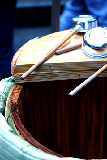 En sortant, nous sommes revenus sur nos pas au niveau de la forêt de bambou, décidés à partir d’Arashiyama pour notre prochaine étape. Mais nous avons fait un détour dans les bambous, et lorsque nous sommes sortis de la forêt, nous sommes tombés sur un petit temple bondé dont je ne sais toujours pas le nom. Il y avait du saké à disposition dans un grand récipient ou chacun pouvait se servir un petit verre !