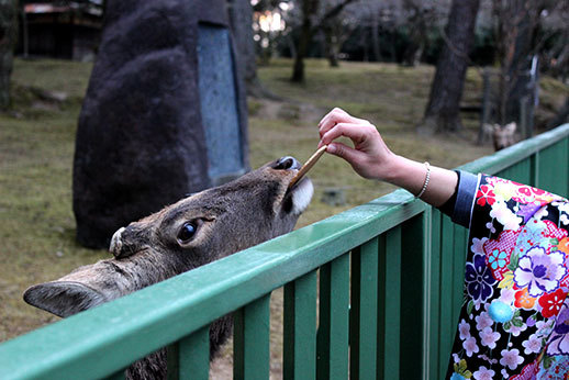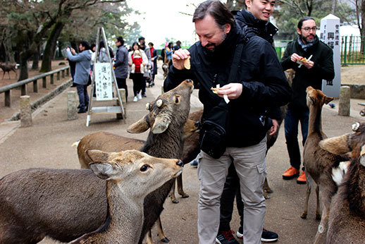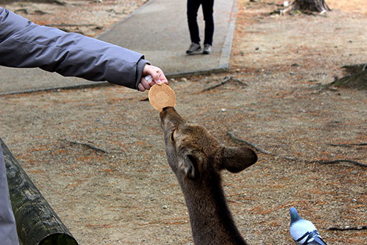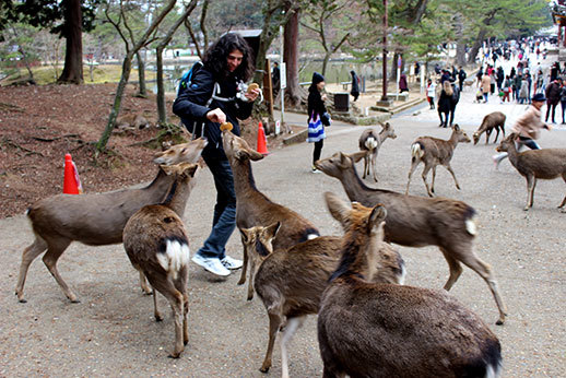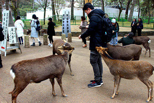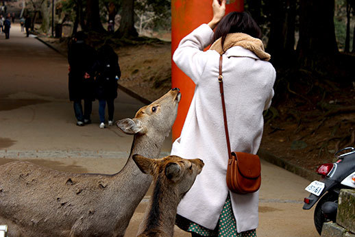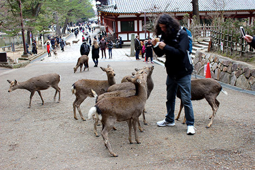La cohabitation avec les humains se passe, de manière surprenante, très bien. Les animaux sont visiblement habitués, et ils sont très dociles. Certains se laissent même caresser. Attention cependant, en présence de nourriture, ils ne se contrôlent plus ! Si vous achetez des biscuits pour les cerfs (il y a de nombreux étals qui proposent des Shika Senbei à travers tout le parc), vous risquez de vous faire poursuivre par un attroupement d’animaux affamés !
