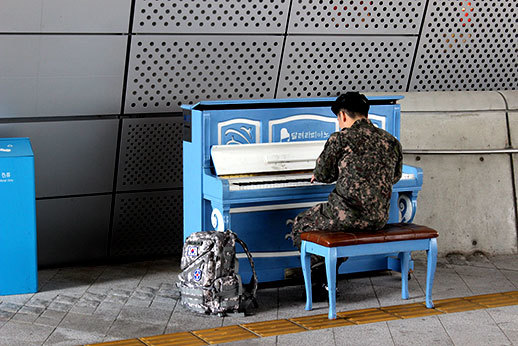 Nous avons pu assister à quelque chose de très étrange : un militaire en uniforme jouait du piano. En France, le plan Vigipirate étant toujours en place, il n’est pas rare de croiser des militaires en fonctions dans les gares ou les grandes villes. Cependant, ils sont en postes. En Corée du Sud, le service militaire est toujours obligatoire (deux ans en moyen). Les jeunes effectuant leur service sont alors en uniforme même hors période de garde. Il est donc impressionnant de voir autant de jeunes porter l’uniforme militaire et vaquer à leurs occupations.