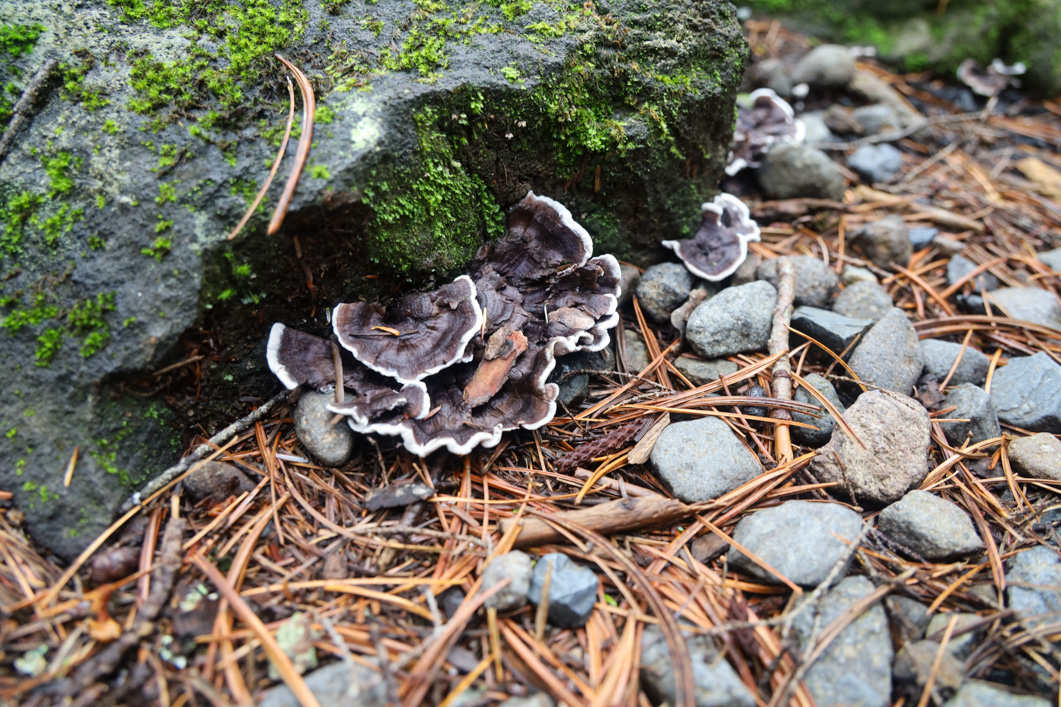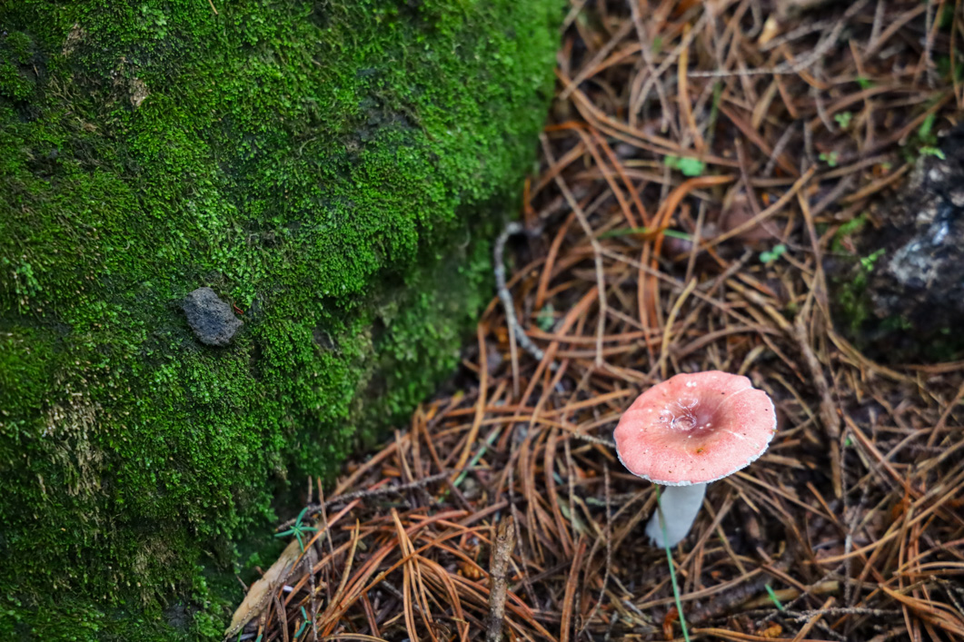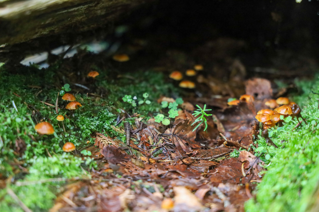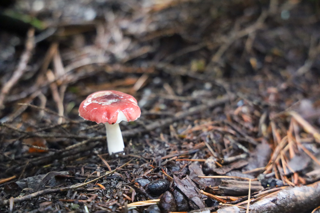 Nous arrivons vers 10h, le parking est complet, et impossible d’attendre à proximité le départ d’autres visiteurs. Le personnel nous condamne à faire des tours de la portion de route précédant et succédant le lac. Nous pourrons nous garer uniquement si une place se libère à l’instant précis où nous approchons du parking. La concurrence est rude, nous tentons notre chance trois fois avant de capituler et retenter notre chance plus tard vers l’heure du déjeuner. En attendant, nous profitons de boissons chaudes dans un petit café proche, qui sert aussi de petite auberge aux randonneurs de la région. La chance nous sourit vers midi et nous pouvons finalement accéder à la forêt. La balade est assez courte, facile et agréable. La boucle doit prendre moins d’une heure théoriquement, mais puisque tout notre groupe se découvre une passion pour les champignons, nous nous arrêtons fréquemment pour les admirer et notre visite devient considérablement plus longue.