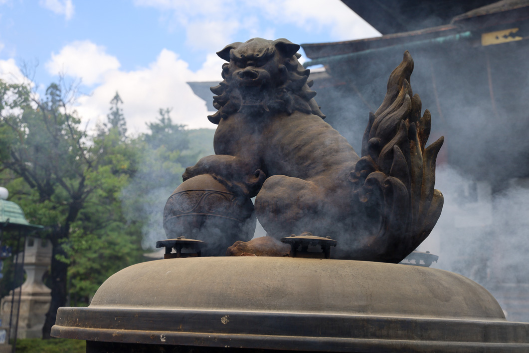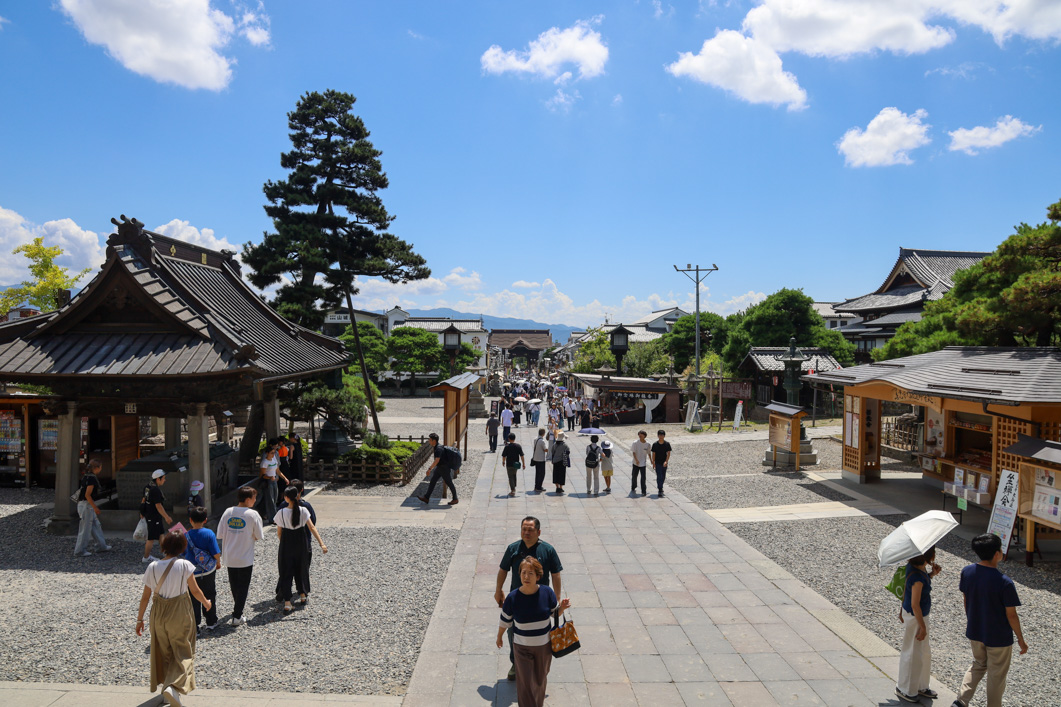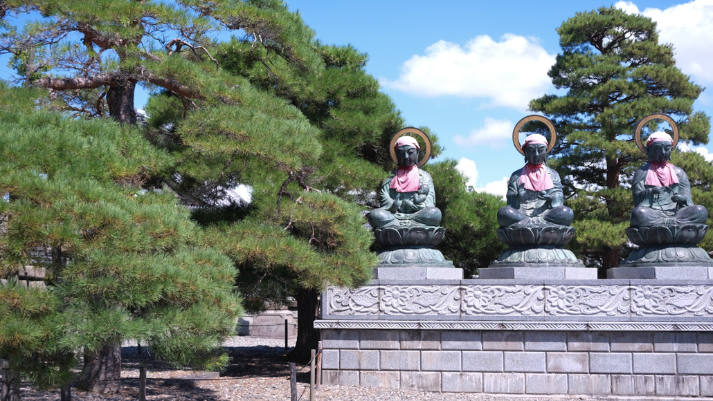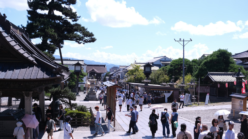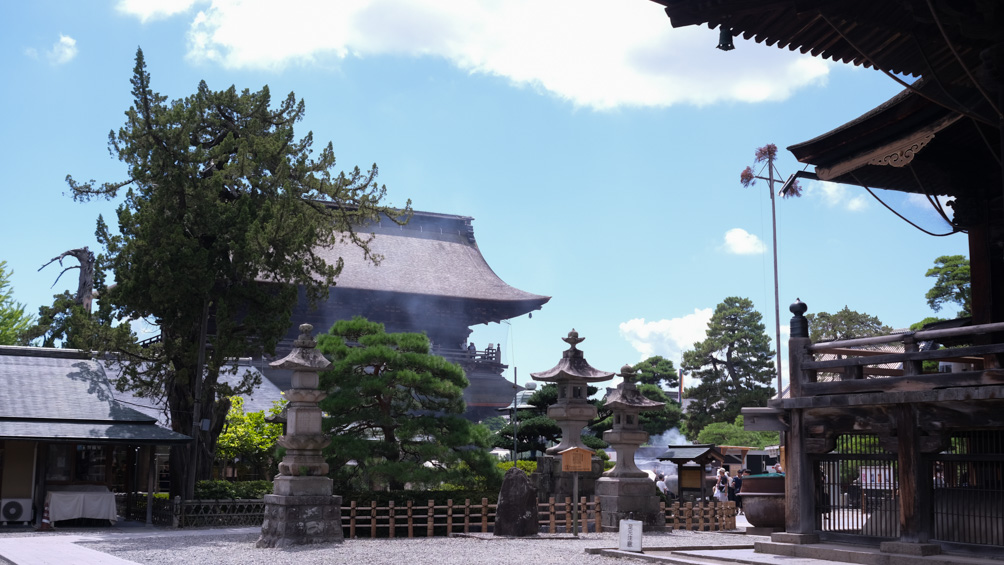 Le lendemain débute par la visite d’un très joli temple, le Zenko-ji, se trouvant dans la ville de Nagano. Une partie de notre groupe tente l’expérience spirituelle du passage sous-terrain. Nous avançons dans le noir complet et cherchons la clé pour le Paradis, avant de rejoindre le reste du groupe à la boutique du temple (sans transition). Un peu plus loin, nous nous risquons à la dégustation de glaces au shichimi (mélange d’épices japonais). Nous ne sommes pas convaincus, mais nous nous régalons avec les oyaki de la boutique d’à côté (tous végétariens !) et la glace au goût de pomme (plus traditionnel), spécialité de la région de Nagano.