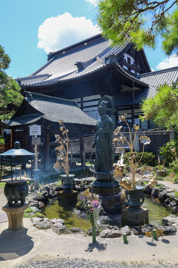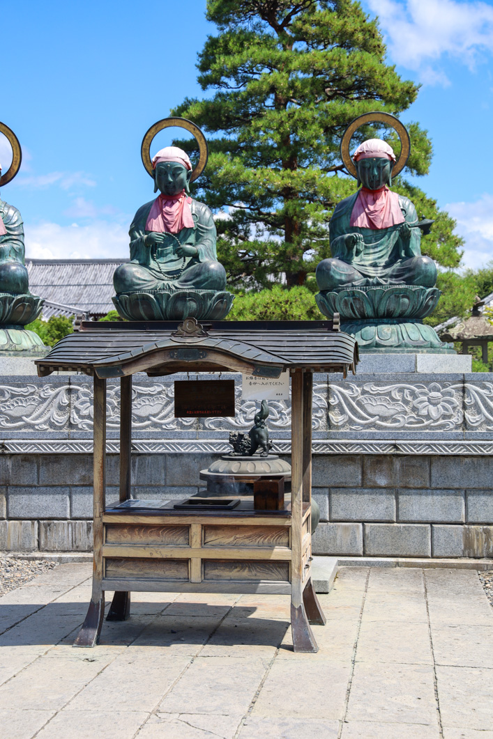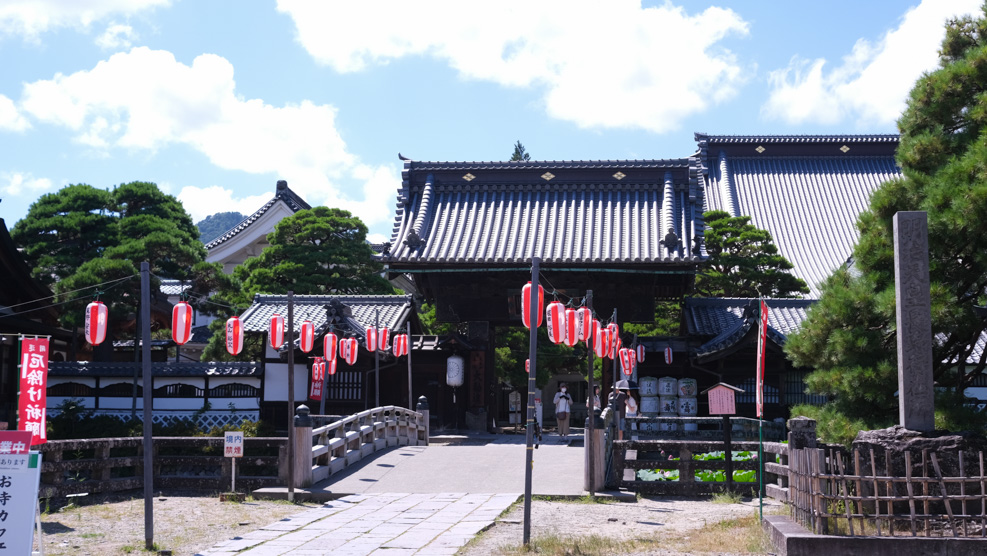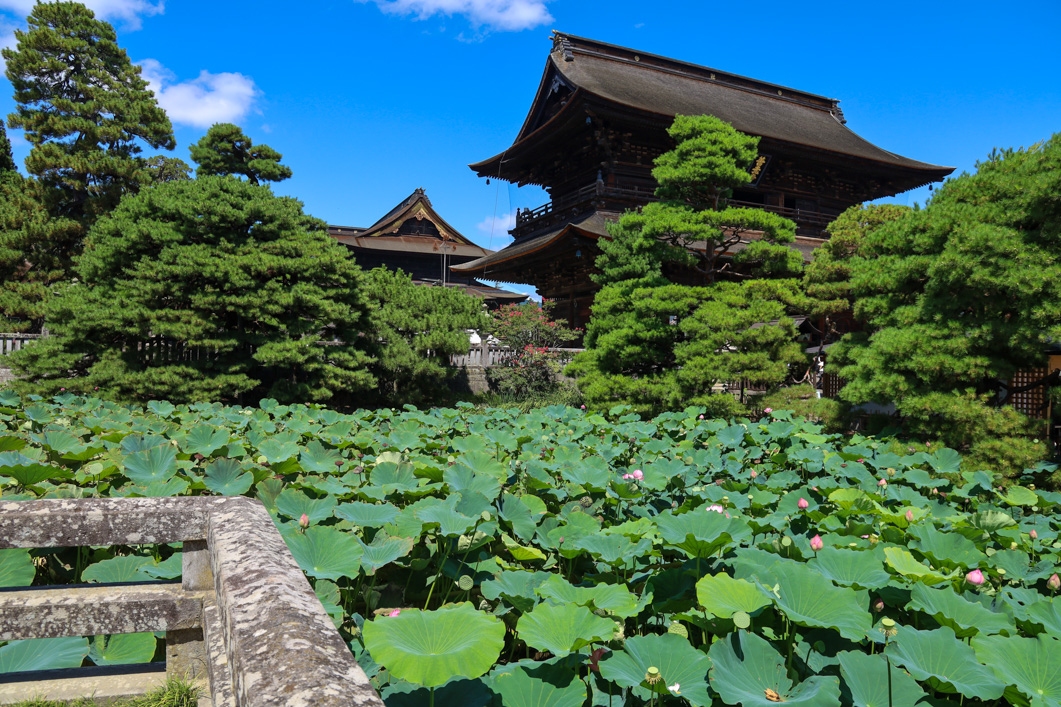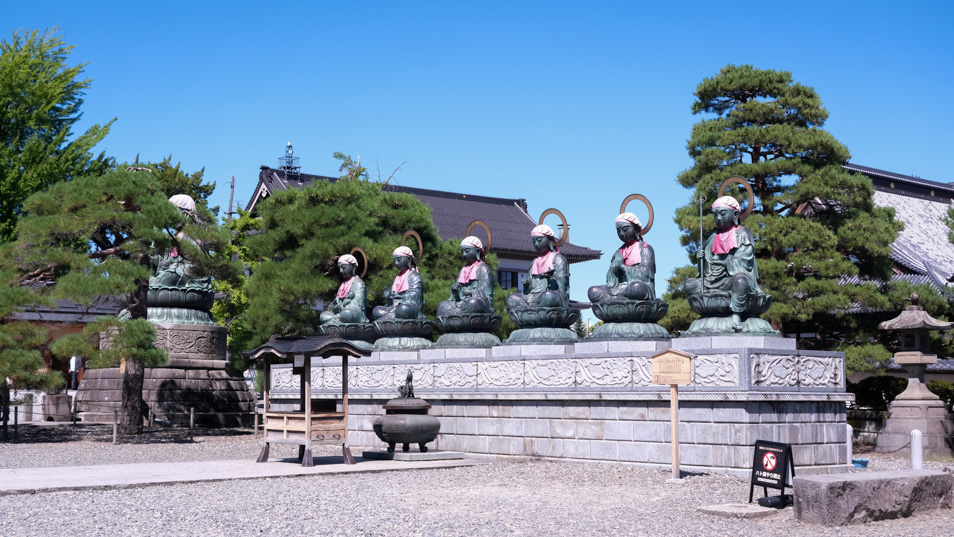Le lendemain débute par la visite d’un très joli temple, le Zenko-ji, se trouvant dans la ville de Nagano. Une partie de notre groupe tente l’expérience spirituelle du passage sous-terrain. Nous avançons dans le noir complet et cherchons la clé pour le Paradis, avant de rejoindre le reste du groupe à la boutique du temple (sans transition). Un peu plus loin, nous nous risquons à la dégustation de glaces au shichimi (mélange d’épices japonais). Nous ne sommes pas convaincus, mais nous nous régalons avec les oyaki de la boutique d’à côté (tous végétariens !) et la glace au goût de pomme (plus traditionnel), spécialité de la région de Nagano.