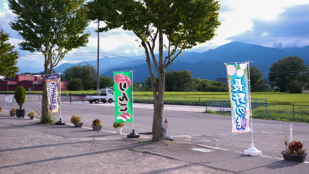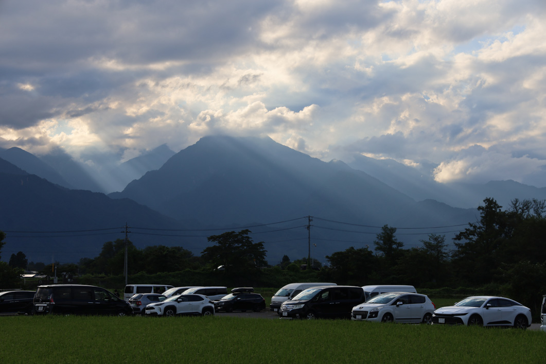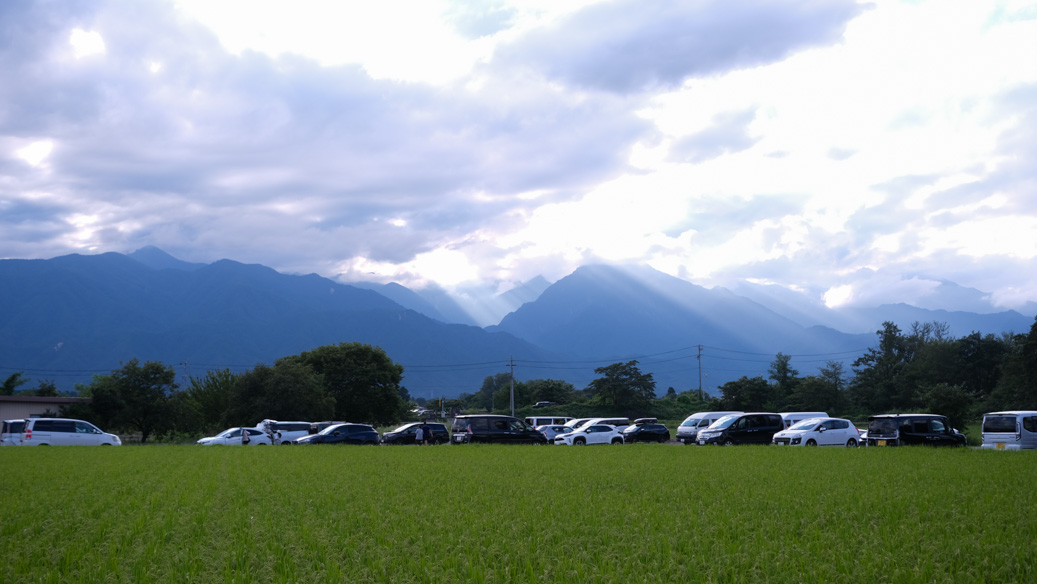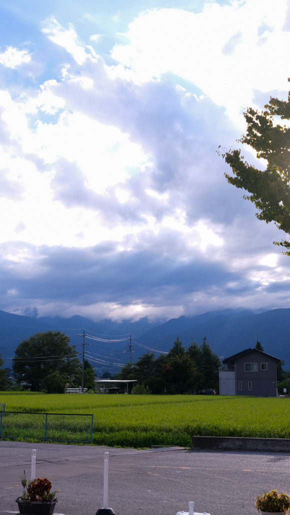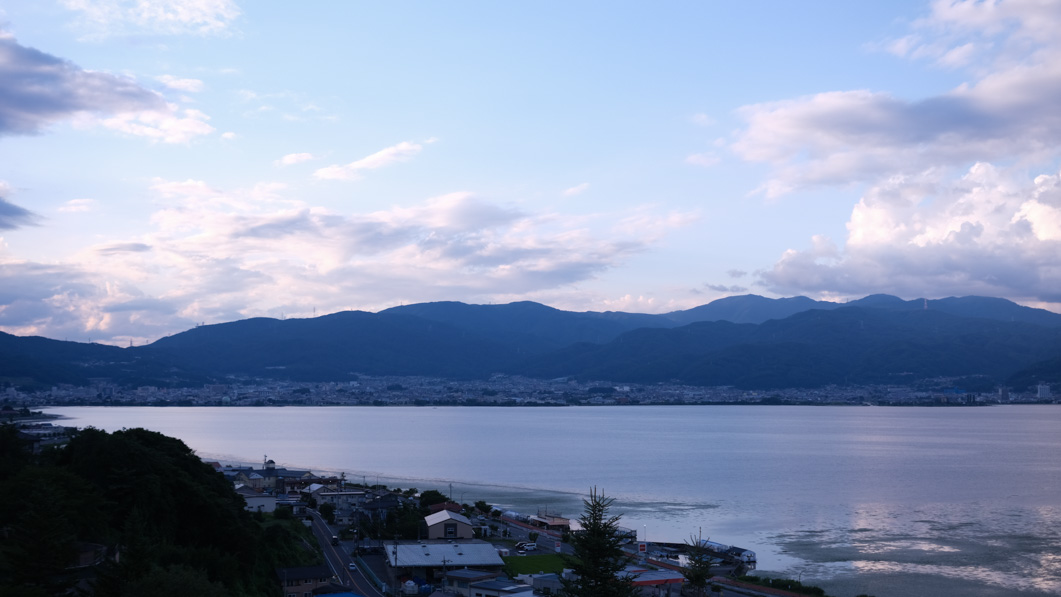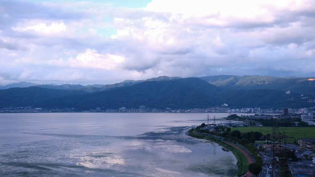 Nous repartons le sac plein d’omiyage et nous roulons avant d’effectuer une dernière pause dans une station service sur l’aire d’autoroute. Elle a une vue superbe sur le lac Suwa, inspiration du film d’animation Your Name.